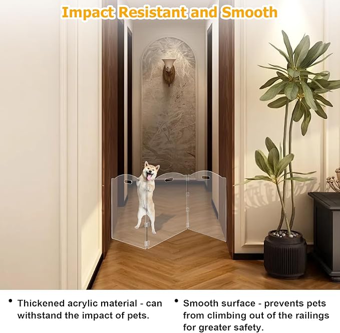- 【Safe and Stable】Acrylic fence has high impact resistance, pets play collision will not be easily damaged or broken, can be used for a long time. Each side of the fence is smooth and can effectively prevent pets from climbing. Also unlike traditional iron fences, this dog gate prevents your pet's teeth or claws from getting stuck, creating a safe and comfortable environment for your puppy, cat, or bunny.