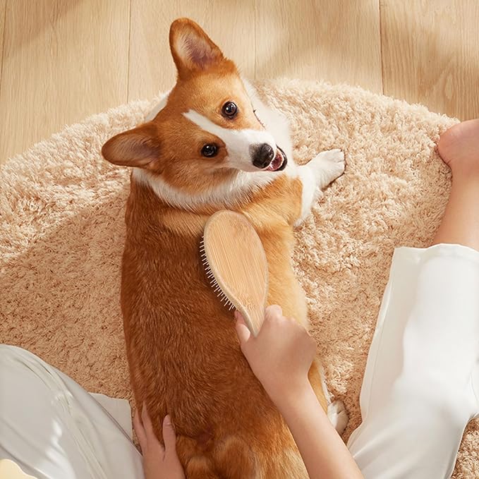- 【Medium Pin Dog Brush】20mm stainless steel round pins can comb through long and thick hair, reaching the undercoat. This wooden dog pin brush effectively cleans sticky dirt, stains, food residue, and tangled hair. The pins are firmly embedded and do not easily fall off. Round-ended bristles ensure a safe and comfortable grooming session for both you and your pet. Medium-length pins are suitable for any hair type on cats and dogs.