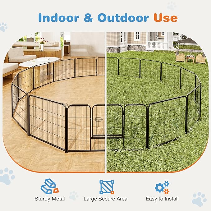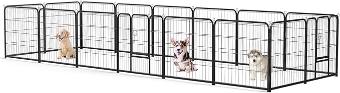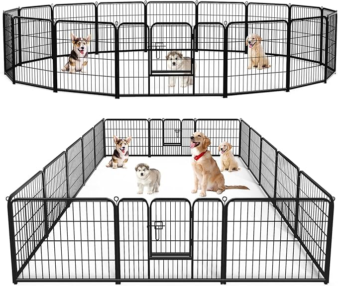 - 【Tailored Options for Every Pet】 Available in 8-panel and 16-panel, with 3 kind of heights: 24”, 32”, and 40”. Our diverse selection ensures a perfect fit for dogs of all sizes and accommodates various pets, such as kitten, cats, rabbits and so on, providing a reliable and comfortable space for all. And it’s easy to assemble this foldable metal dog pen according to the desired area of use.