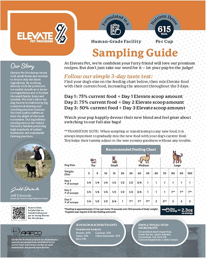- Premium Nutrition For All: At Elevate Pet Provisions, we believe that premium nutrition should be accessible to all dogs at low costs. With no compromise our excuses. That is why our 100% human grade dog food, veterinarian approved formulas deliver unmatched quality at unmatched prices. Thanks to our integrated operation, from ranching to air-drying, we eliminate unnecessary costs, ensuring savings are passed directly to you, the dedicated pet parents.