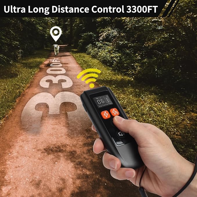 - 【Impressive Remote Range】The e collar for dogs training has a remote control distance of up to 3300 feet, you can train your dog even at a distance. The powerful remote of ecollars for dog training ensures you have full control, whether you're in the backyard, park, or during off-leash adventures.