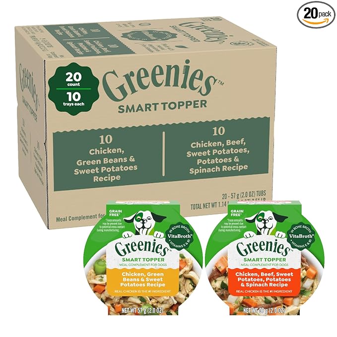 - Contains ten (10) 2.0 oz. Trays of Greenies Smart Topper Wet Mix-In for Dogs-Chicken, Green Beans & Sweet Potatoes and ten (10) 2 oz. Trays of Greenies Smart Topper Wet Mix-In for Dogs Chicken, Beef, Sweet Potato & Spinach both in Vitabroth