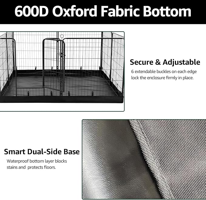 - 【 More stable and bottom pad 】 Using 600D Oxford bottom pad, each side has 6 hooks to fix it to the dog fence, making it installed under the dog pen and not easy to move. It will protect your floor from damage. When the base pad needs to be cleaned, you can directly rinse it with water, and after rinsing, it will look like new! (Note: The bottom pad can only be hand washed and cannot be machine washed!!!)