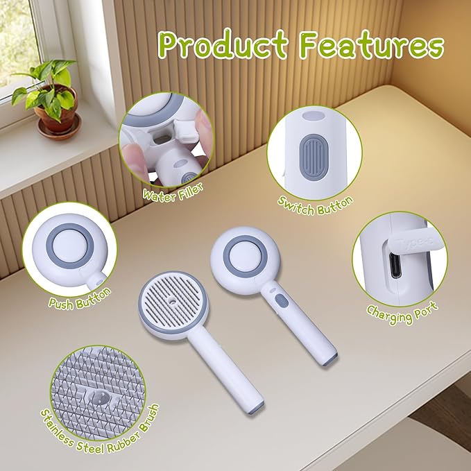 - 【Spray Function】Use our cat brushes for indoor cats with spray function to bring a comfortable grooming process to your pet. The spray reduces static electricity and flying hair while combing, making the grooming process more comfortable and seamless. This helps minimize tangling and knotting problems.