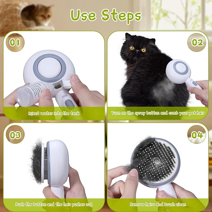 - 【Pet-Friendly Design】Humanized brush design, bristles wrapped in protective gel, our steam cat brush ensures your pet's skin is not harmed. Effectively removes dead skin and loose hair, improves hair health. You can add conditioner or softener to the spray to enhance the softness and shine of your cat's hair.