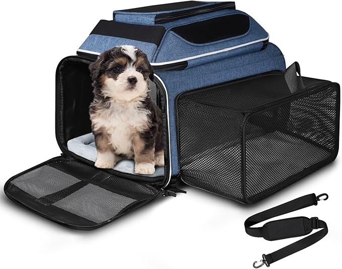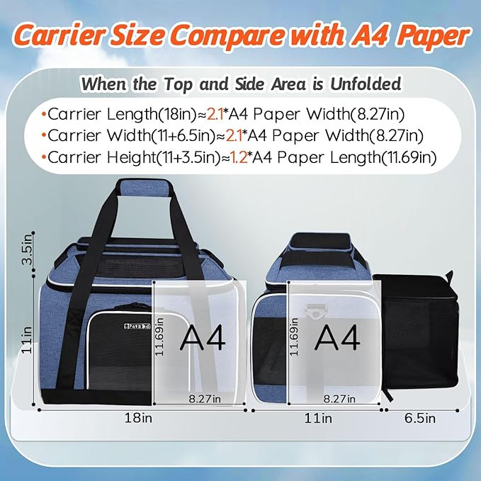 Petskd Top and Side Expandable Pet Carrier 18x11x11 Inches Delta United Airline Approved, Soft-Sided Carrier for Small Cats and Dogs with Locking Safety Zippers and Anti-Scratch Mesh(Blue)