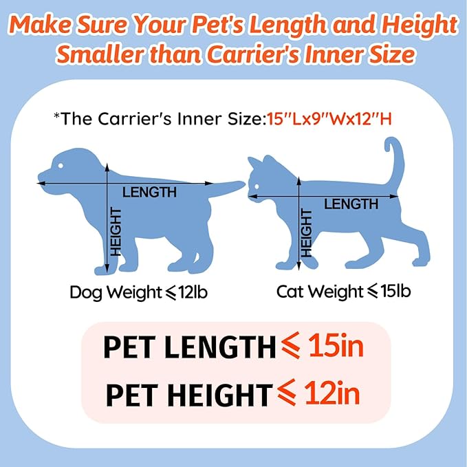 - 【CHECK SIZE BEFORE BUYING】In order to fit the under-seat dimensions of airlines, this carrier can only fit small dogs and cats. We recommend that the pet size you carry be within 15"L x 9"W x 12"H and the DOG max weight is 12LB, CAT max weight is 15LB. Please don't choose the carrier only based on weight but also reference your pet's length and height.