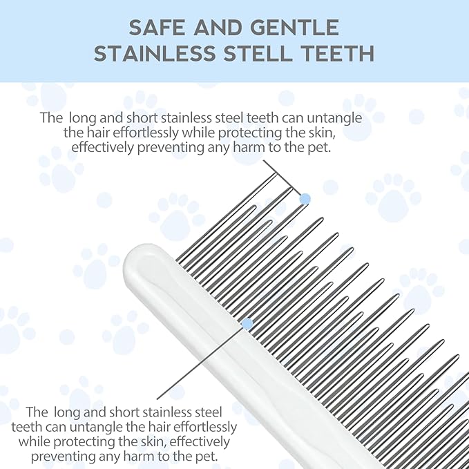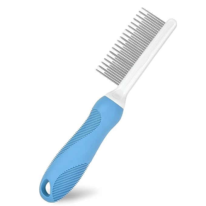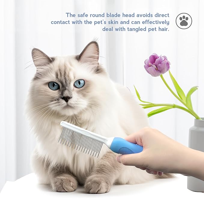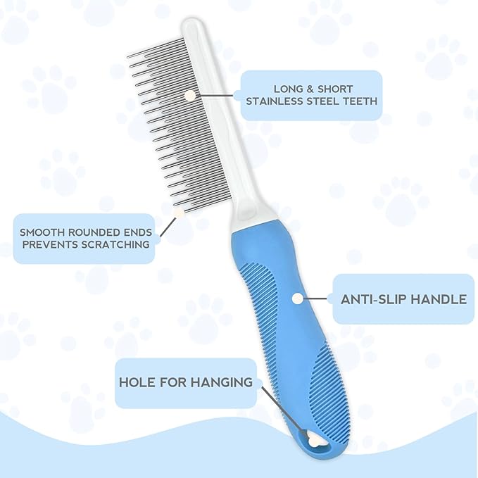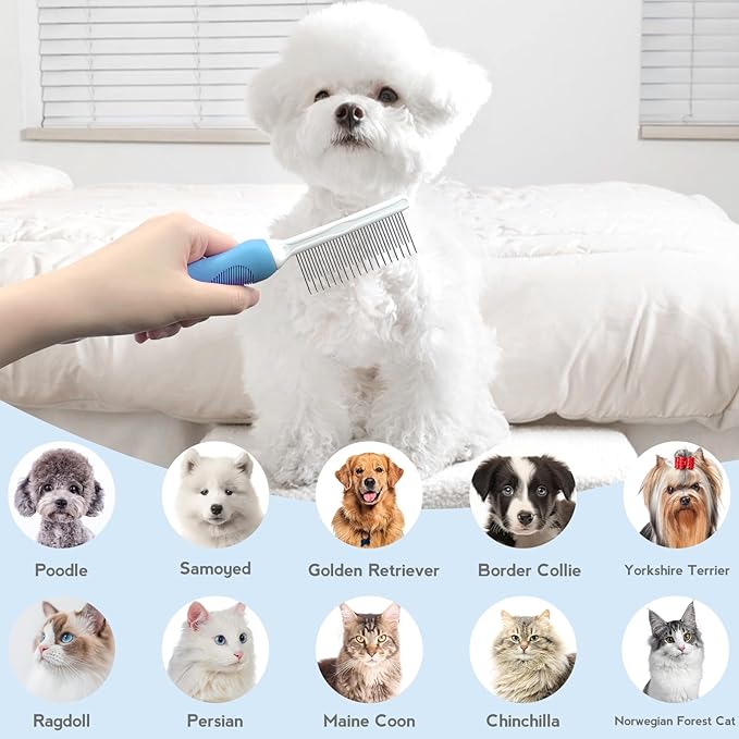 Detangling Pet Comb for Dog & Cat, Grooming Comb with Long & Short Stainless Steel Teeth, Safely Remove Knots & Tangles for Healthy Shiny Coat, Gentle Effective Detangling Tool for Pet Hair (Blue)