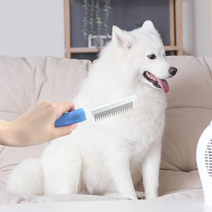 Detangling Pet Comb for Dog & Cat, Grooming Comb with Long & Short Stainless Steel Teeth, Safely Remove Knots & Tangles for Healthy Shiny Coat, Gentle Effective Detangling Tool for Pet Hair (Blue)