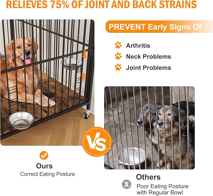 - 3. Adjustable Feeding Station: This wooden dog kennel included are two stainless steel dog bowls that rotate 360 degrees and adjust to different heights. This design promotes healthy digestion and is gentle on your dog's cervical spine, ensuring their comfort while eating.