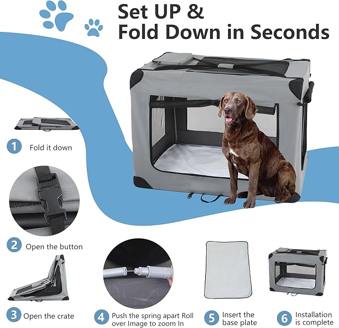 - 🐶【Fortress of Safety】The portable dog crate has a strong frame and reliable closures, and it is made of premium, pet-friendly materials. Your pet can remain cool and aware of their surroundings thanks to the mesh panels' superior ventilation and visibility.