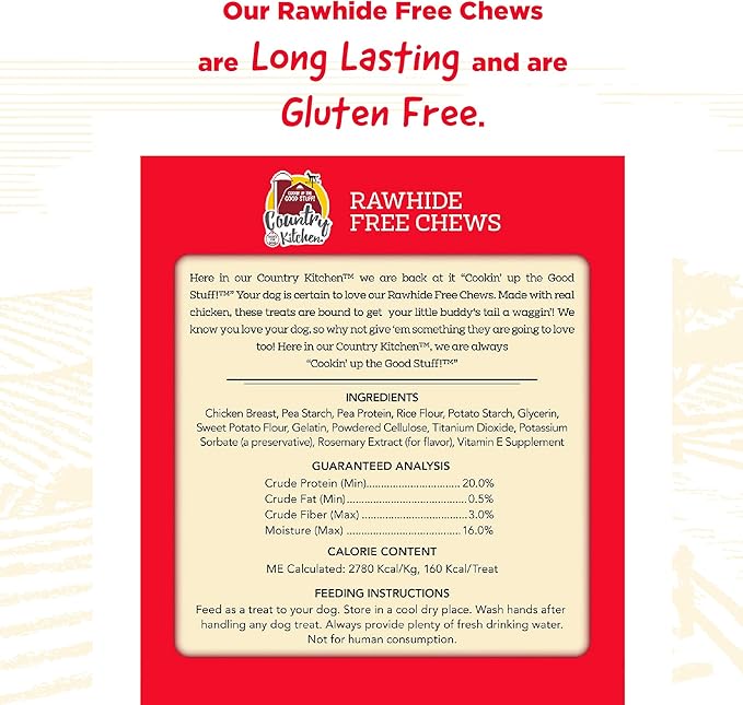 - Country Kitchen Rawhide Free Dog Chews: Our 100% rawhide free chews are made with real chicken as the first ingredient