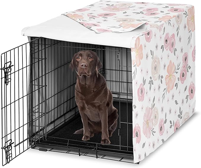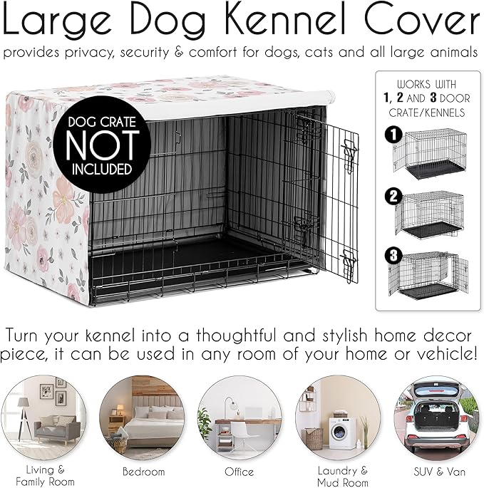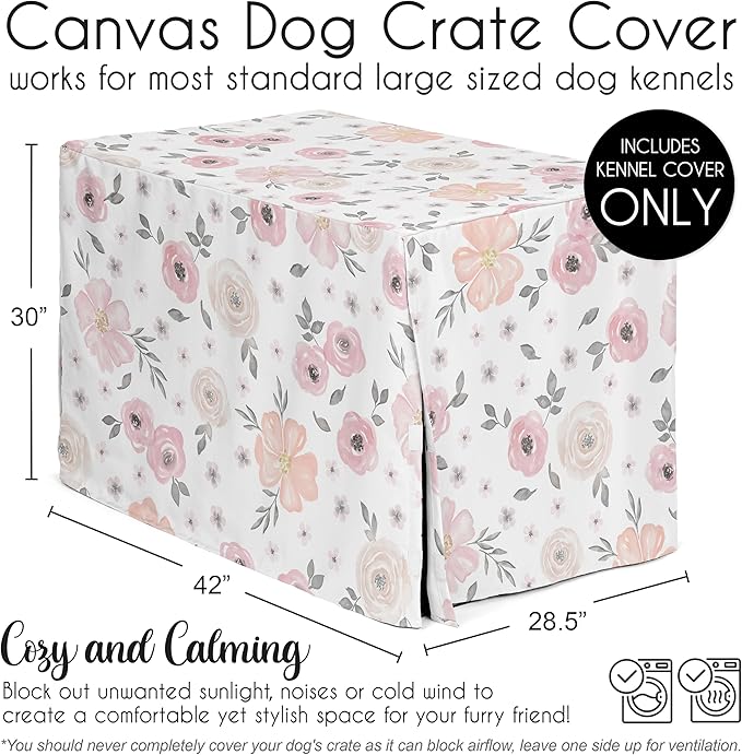Sweet Jojo Designs Blush Pink Grey Boho Floral Dog Crate Cover – Kennel Covers for 42 Inch Pet Cage Medium/Large - Bohemian Farmhouse Shabby Chic Rose Lily Watercolor Flower Elegant Gray and White