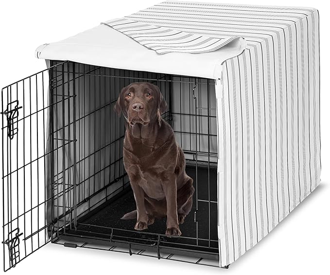 - This durable and stylish dog crate cover is the best way to create a comfortable and cozy space for your four legged friend with a protective canvas fabric that securely covers the top of your pets cage for a dark and tranquil crate at all times. Give your puppy a space where they can rest and relax after a long day of playing or secure flaps with our hook and loop closure design to allow your pet to enter and exit as they please.