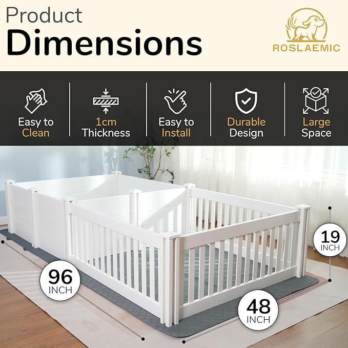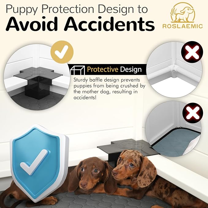 - Sturdy & Easy Install - Roslaemic welping box is made of Pet-friendly plastic. The 19-inch-tall dog whelping pen has internal dimensions of 96 x 40 inches. Installation takes only five minutes and no tools are required.