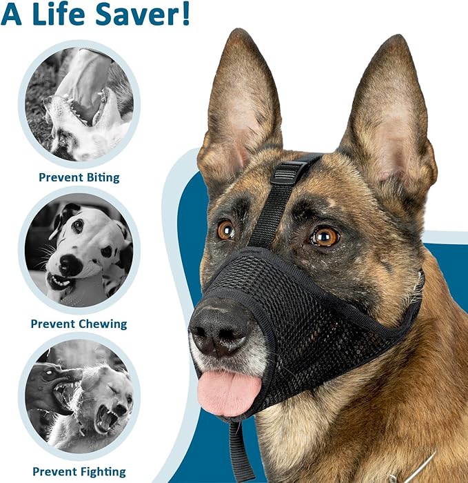 - Muzzle Up for Better Behavior Control-This german shepherd muzzle prevent biting, furniture destruction, excessive barking and dog fights while allowing panting, drinking, and eating. Ideal for vet visits, grooming, nail trimming, and walking, it fosters friendly interactions with other pets and people. Note: The muzzle is a training tool, not a fix for bad habits, and requires your guidance and positive reinforcement