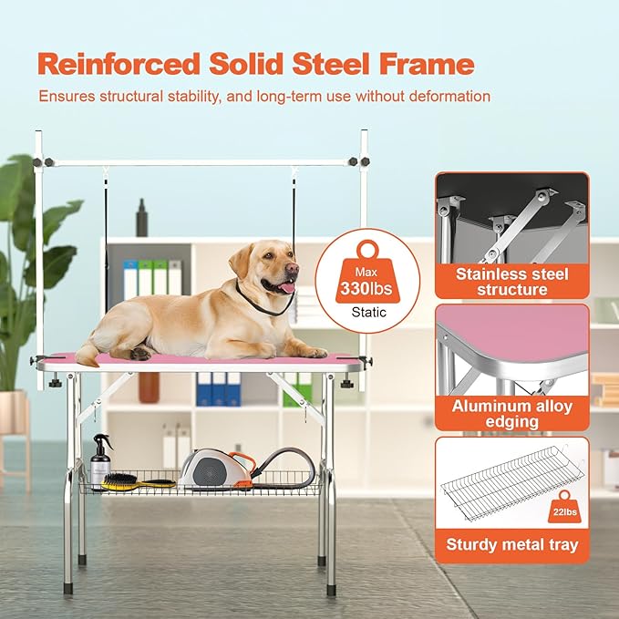 46'' Dog Grooming Table for Large Dogs, Foldable Professional Grooming Table for Dogs at Home with Double Loops/Mesh Tray/Adjustable Arm, Capacity up to 330lbs, Pink