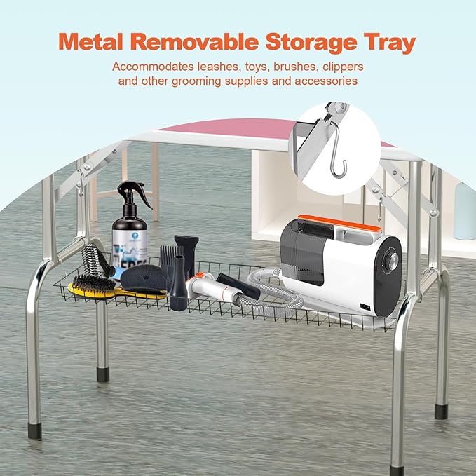 - Thoughtful Details: Premium non-slip and waterproof silicone countertop brings a soft and gentle touch to pet paws and grants a hassle-free pet hair cleaning experience; The rounded table edges and dual leash design avoid pets undesired damage or injury; The reinforced storage shelf accommodates leashes, toys, brushes, clippers, and other grooming supplies and accessories
