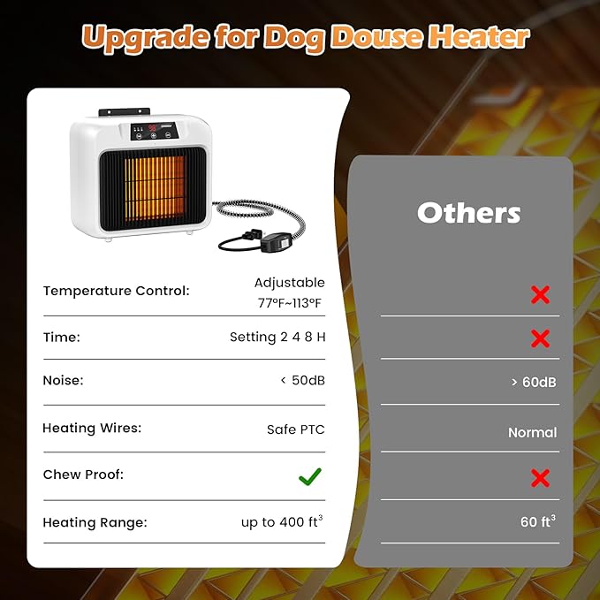 - ใ๐๐๐๐ ๐๐ฉ๐ ๐ซ๐๐๐ ๐๐จ๐ ๐๐๐๐ญ๐๐ซ ๐๐๐ ๐๐๐ฌ๐ข๐ ๐งใThe Chtoocy dog house heater design an innovative solution for the Winter Pet House. We upgrade new Model: HT06. The Pet heater features a 6.5FT external temperature probe for precise monitoring of the dog house temperature. This ensures optimal performance, as the heater operates based on the actual conditions inside, delivering a consistently warm environment.