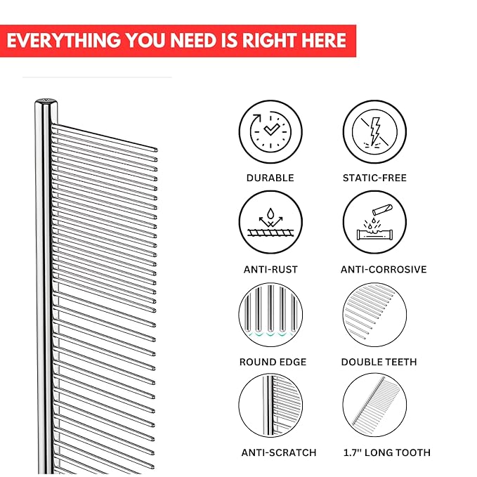 - ✅ RISK-FREE LIFETIME GUARANTEE: Our pet hair removal tool is made from sturdy and premium comb material. We firmly stand by the lasting quality of our pet grooming tool. If for any reason you're not 100% happy with it, reach out to us to receive a refund or replacement. This dematting comb for cats and dogs is made with high carbon stainless steel. Our Dog comb is static free , rust proof and anti scratch. This cat comb from cat grooming supplies gives a lifetime and premium grooming metal dog comb for long haired and short hair dogs, cats and pets.