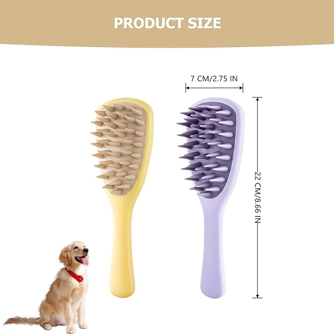 - Package Highlights: Embracing two vibrant dog bathing brushes, available in charming yellow and purple hues. Measuring a convenient 22*7 cm (8.66*2.75 inches), these hues infuse a joyful accent into your pet grooming sessions.
