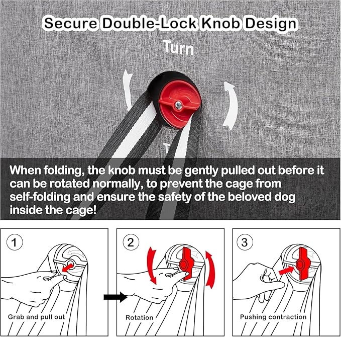 - Safety knob & Zipper & Leash: To ensure the safety of your beloved dog inside the crate, our knob is designed with a two-step locking mode. When folding, you need to gently pull it out before you can rotate it normally, to prevent the crate from suddenly folding. The safety leash inside our dog crate clips onto your dog's collar to ensure they stay safely inside it. It also comes with a heavy-duty self-buckling zipper for added security.
