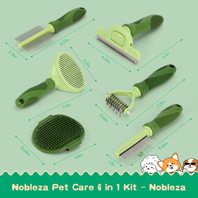 Nobleza 6PCS Dog Grooming Kit, Self-Cleaning Slicker Brush with Massage Tips, Dematting Comb for Shedding and Tangles, Ergonomic Bath Brush, Adjustable Handle, Safe for Dog Cat Puppy, Green
