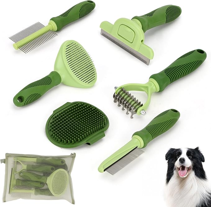 - All-In-One 6-Piece Pet Grooming Kit: Upgrade your pet care routine with this Complete Grooming Set, perfect for dogs and cats with medium to long fur! The set includes a shedding brush, hair removal comb, detangling comb, double-sided brush, bath massager, fine flea comb, and a handy storage bag—all designed to make grooming faster and stress-free.