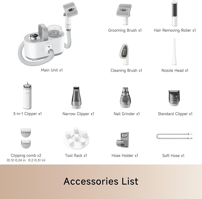 - 7 in 1 Pro Pet Grooming Kit: This pet grooming kit, equipped with a vacuum, simplifies the grooming process at home. The kit includes a grooming brush and a deshedding tool that work together to gently remove loose hair, leaving your pet's coat looking shiny, smooth, and tangle-free. The electric clipper, paw trimmer, and nail grinder offer precise and high-quality cutting, ensuring your pet receives the best grooming experience possible. With the nozzle head and cleaning brush, you can effortlessly collect pet hair from carpets, sofas, and floors, keeping your living space tidy and pet hair under control.