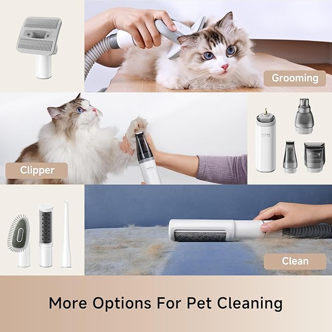 - 5 Adjustable Suction Levels: Mova cats grooming vacuum is designed for quiet operation, operating at a mere 55 dB, and features 4 adjustable power modes. Tailor the suction to match your pet's size and comfort level, transforming grooming into a stress-free and enjoyable experience for your furry friend.