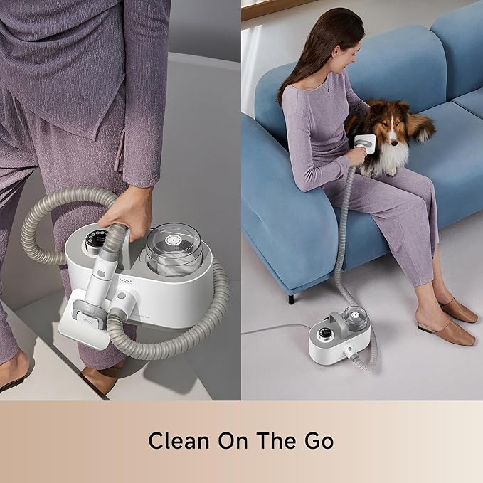 - Simultaneous Grooming and Cleanup: Mova pet grooming vacuum kit with its integrated vacuum capability, captures an impressive 99% of pet hair in its vacuum container. As you groom your pet, the loose hair is efficiently drawn into the vacuum's dust box, ensuring no mess and maintaining the cleanliness of your home.