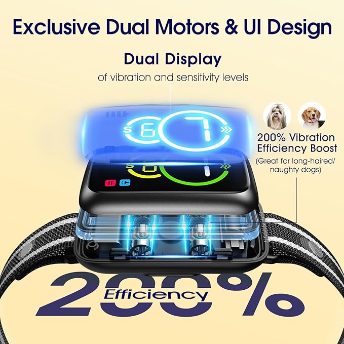 - 【THE THINNEST BARKING COLLAR EVER, WITH DUAL NUMBER DISPLAY】The smart dog bark collar with a double-digit UI display allows you to clearly see and adjust the level of sensitivity and vibration/Beep at the same time. The settings on this barking collar for dogs are also very simple. You just need to use the power button to switch to the desired mode, and then use the level adjustment button to set the level you want, which is super easy to use