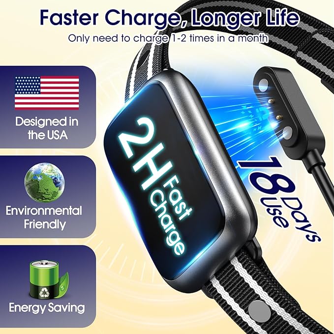 - 【CHARGE FASTER, LAST LONGER】 The no bark collar for large dogs can be fully charged within 2 hours using the exclusive Flashsec charging technology. The upgraded battery effectively extends the battery life of the bark collar for small dogs 5-15lbs to 18 days. Charging only 2 times a month is more convenient and environmentally friendly. In addition, the magnetic charging method greatly improves the waterproofness of the bark collar for medium dogs, allowing you to train your dog anytime, anywhere