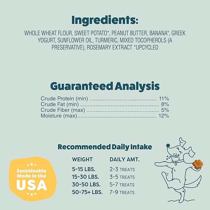 - Made with real peanut butter, banana, and greek yogurt, your pup will love these treats. These delicious dog treats and cookies are made with fiber-rich upcycled sweet potato to support healthy digestion.