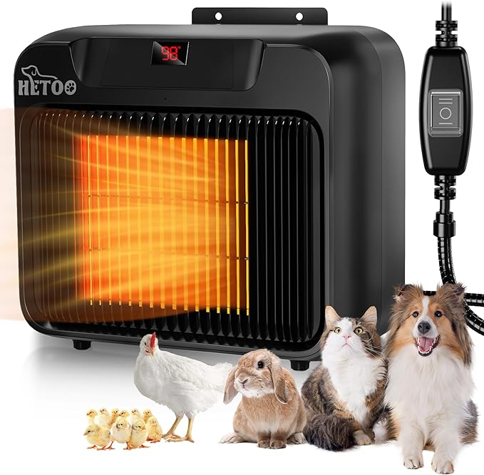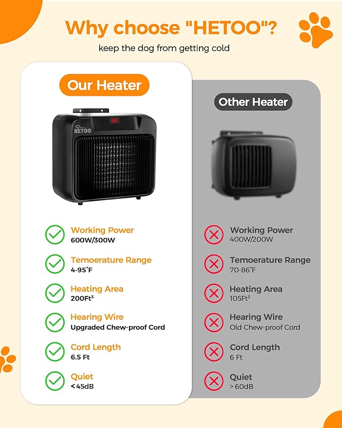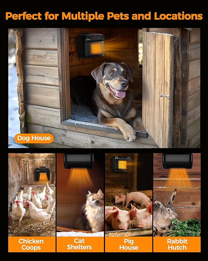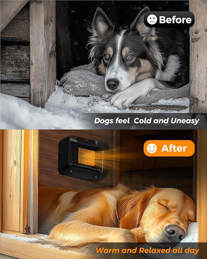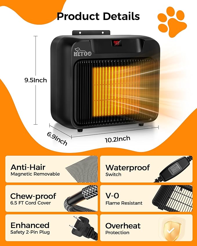 - Upgrade Well Made & Durable Safety: HETOO dog house heater outdoor integrates powerful safety features, equipped with anti-tip design, auto temperature regulation, overheat protection,and an upgraded 6.5 ft chew-resistant certified cord, ensuring a safe and cozy environment for your dog