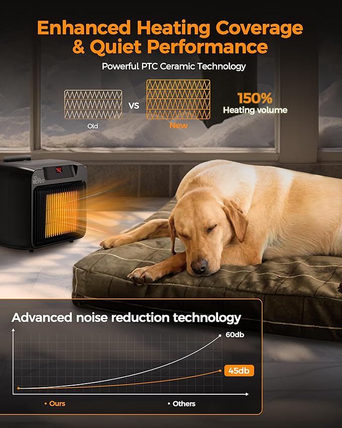 - Quiet Design: Have you ever heard the sound of a gentle breeze rustling through leaves? It’s close to 50 db, but our heater uses a brushless DC motor that reduces noise to just 45 db, making it suitable for noise-sensitive pets. It won't disturb you or your pets, even indoors.