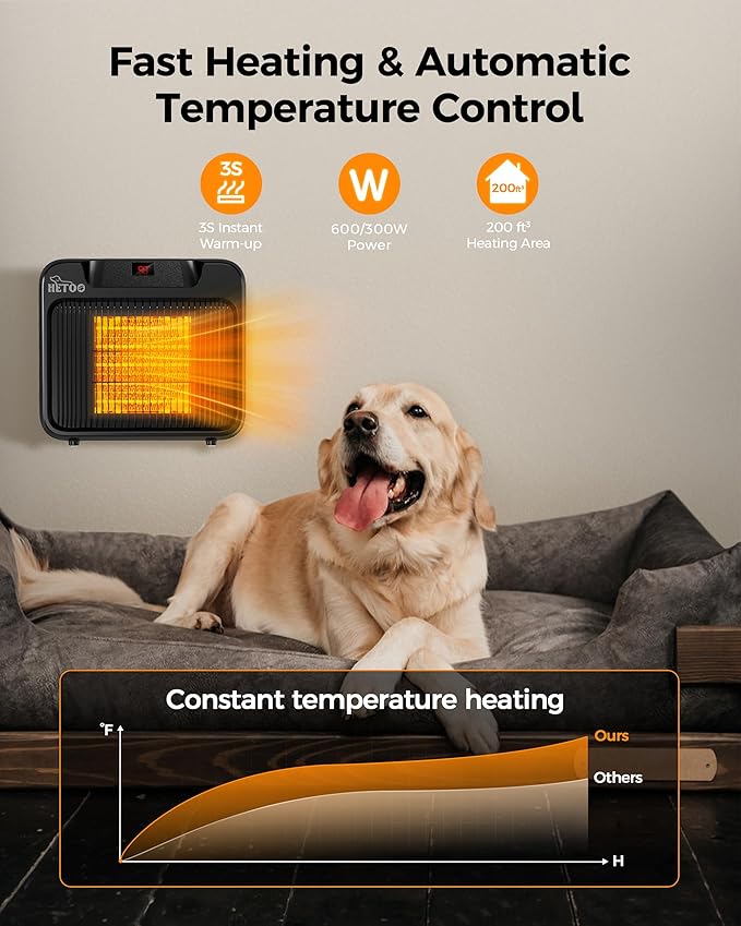 - Fast Heating & Temperature Control: The dog kennel heater combines an advanced PTC system and high-efficiency fan heat up in just 3 seconds. Using 300W and 600W settings to heat spaces up to 200 ft³. Note: This heater does not have an automatic shut-off feature.