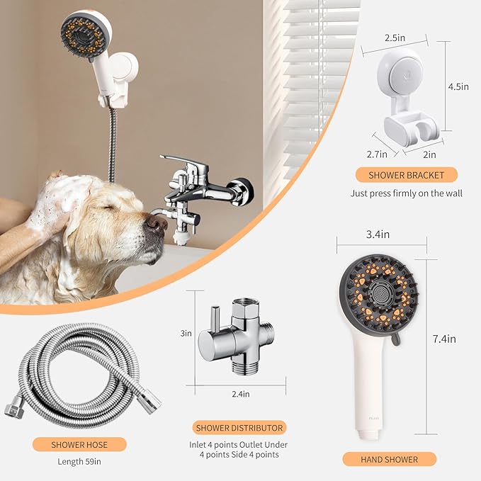 - [Dog bath supplies] Includes 1 pet shower head, 1 59in shower hose for extended reach, 1 diverter , 1 press type shower bracket, 2 rubber washers to prevent leakage. The kit has everything you need for a complete water brush spa for dogs station and superior clean at home.