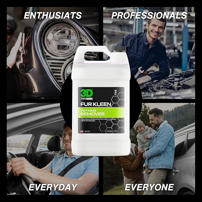 - Professional-Grade Formula: Made by 3D Car Care, a trusted name in the automotive detailing industry, Fur Kleen is a high-performance pet hair removal solution for both pet owners and professional detailers. Whether you're maintaining your personal vehicle or detailing cars for clients, Fur Kleen delivers powerful, reliable results every time