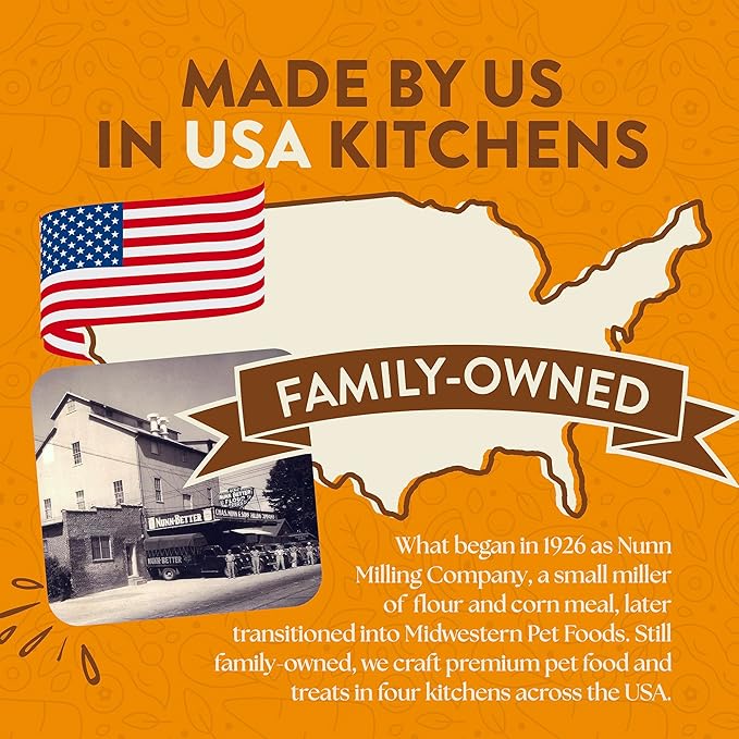 - Grain-free, gluten-free dog nutrition made in USA kitchens.