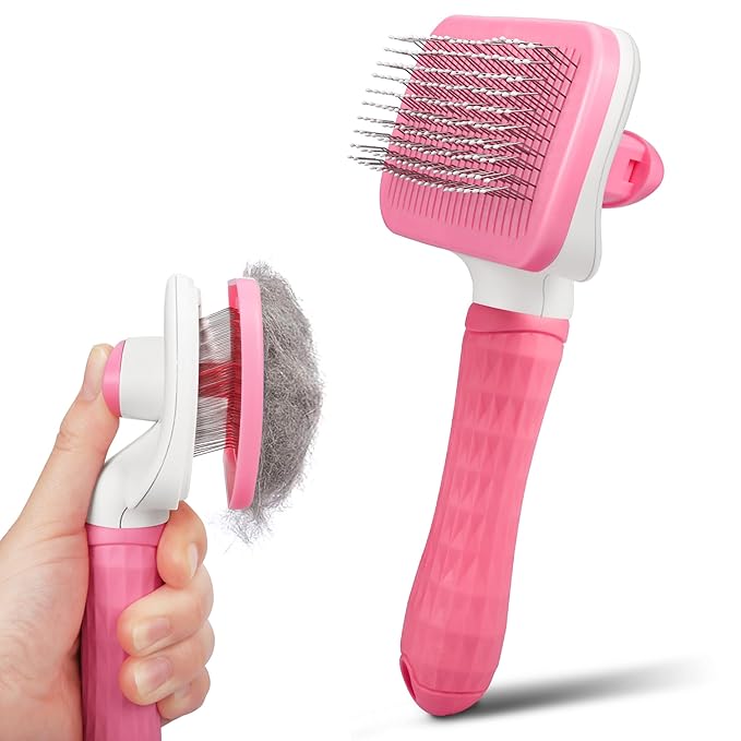 Self Cleaning Slicker Brush for Pets, Massaging & Grooming, Removes Loose Undercoat & Portable Comb for Long Short Haired Dogs & Cats (Pink)