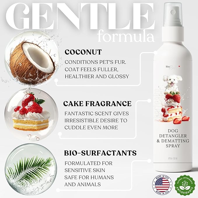 - EXCELLENT SMELL - With dog detangler and perfume mix forget booring baths and smelly dog with natural unique formula with heavenly sweet strawberry shortcake fragrance. Pet friendly perfume is long lasting and leaves your dog smelling fresh and cuddly all day long. The scent is soft and doesnt irritate dogs sensitive nose. This dog odor spray is perfectly safe for puppies as its formulated with gentle, non-toxic ingredients keeping their delicate skin and coat nourished.