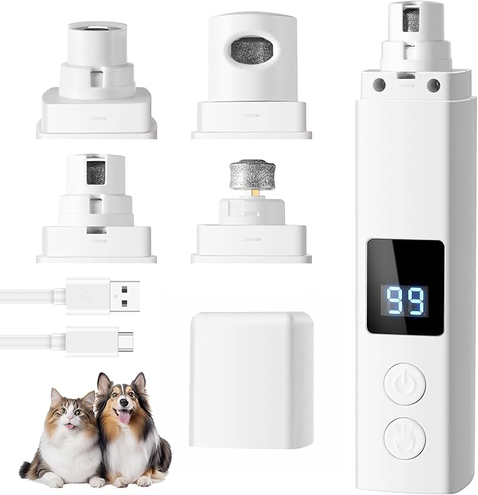 - 【Rechargeable Design】: Pet nail grinder for dogs adopts a rechargeable design. It can be used continuously for 2 hours after charging for 3 hours, so you can trim your pet's nails anytime, anywhere. The clear power indicator screen can accurately display the real-time power level from 1% to 100%, so you can keep track of the power status at any time and say goodbye to power anxiety.