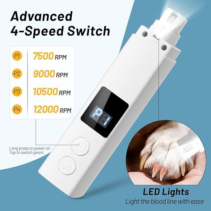 - 【Four-speed Adjustment】: The dog nail grinder has 4 adjustable speed gears (low, medium, high, and ultra-high) to provide your pet with a variety of grinding options. Whether it is the delicate nails of small dogs or the hard nails of large dogs, you can find the most suitable trimming speed to effectively improve the trimming efficiency.