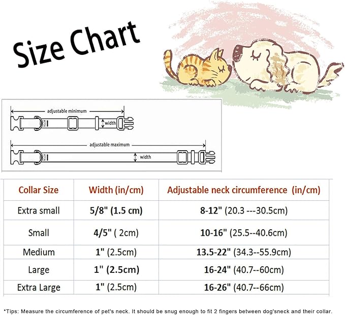 - Adjustable Dog Collar: This XS heart dog collar is perfect for puppies and small dogs, with an adjustable neck circumference of 8"-12", Width 5/8". Always leave room for two fingers between the collar and your dog's neck