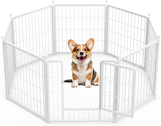 HealSmart Dog Playpen 24 Inch 8 Panels, Heavy Duty Metal Portable Pet Playpen Indoor Outdoor for Camping, Yard, RV, Garden Fence, Privacy Patio, White