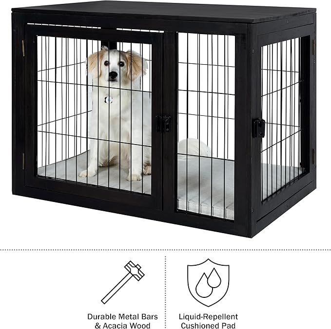 - DURABLE - This pet crate is made of metal enclosure bars and durable acacia wood to ensure this dog crate table looks great for years to come. The liquid-repellent fabric on the included cushioned pad allows for a mess-free cleanup.