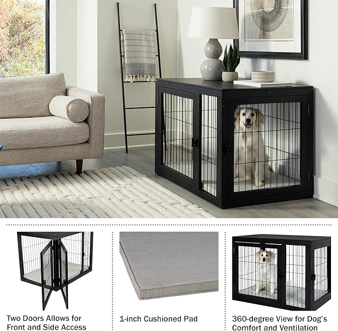 - COMFORTABLE DESIGN - The wood dog crate is equipped with two doors, allowing for front and side access, a 1-inch cushioned pad that is removable for easy cleaning, and a 360-degree open view so your dog can see you and get plenty of ventilation.