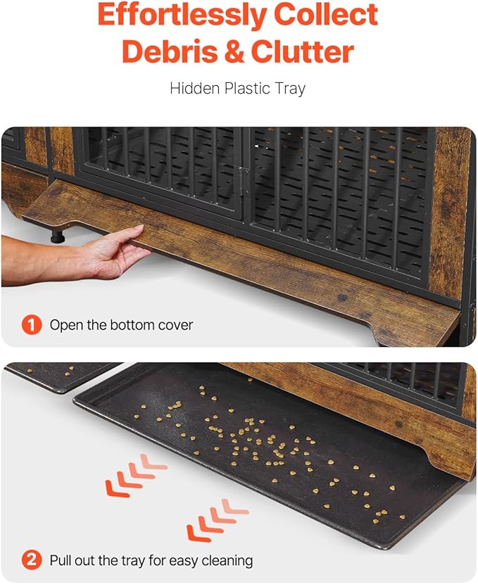 - Tray Design: This dog crate furniture large breeds comes with two hidden trays at the bottom to catch debris, fur, and dirt. Simply open the cover to remove and clean, keeping your pet's area tidy without dirtying the floor.