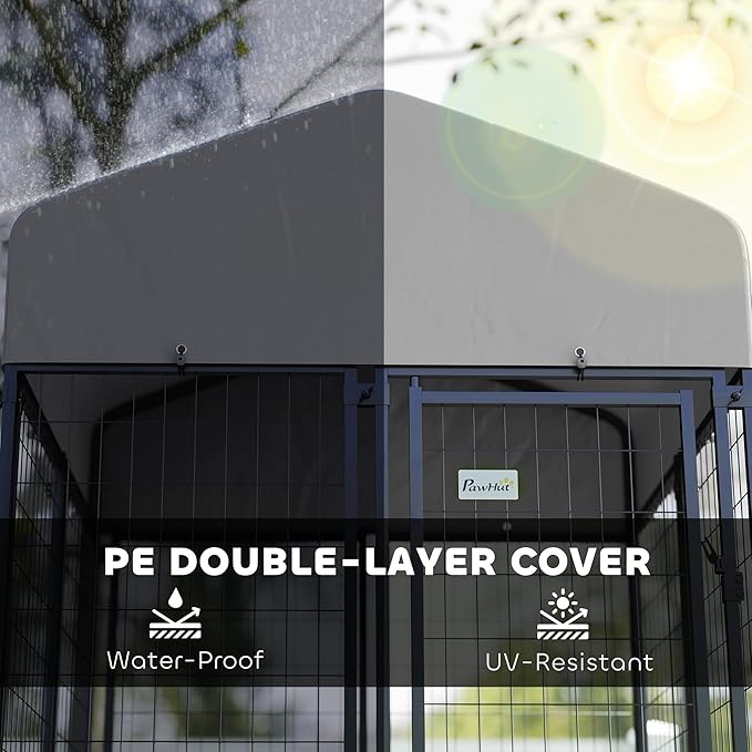 PawHut 3.9' x 3.9' x 6' Outdoor Dog Kennel, Welded Wire Heavy Duty Dog Run with 360° Rotating & 4 Level Adjustable Bowls, Dog Kennel Outside with Waterproof & UV Resistant Cover, for S&M Dogs